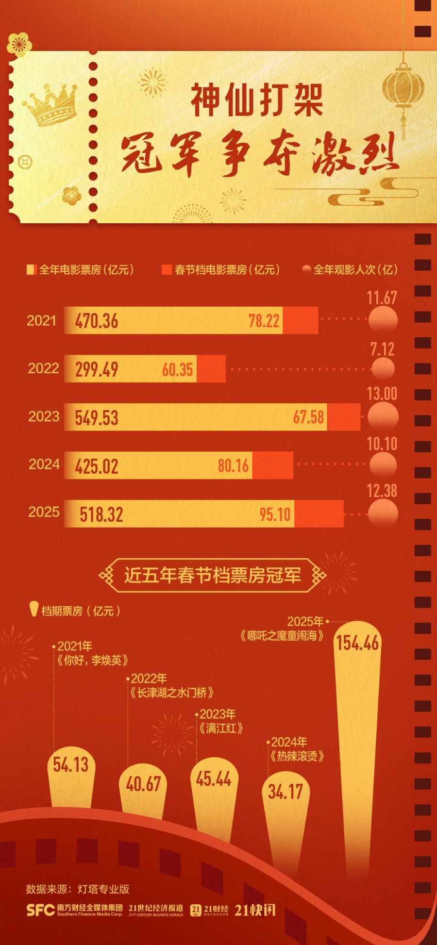 回望近年来的春节档票房成绩,多在60亿元以上,而2025年达到了95.10亿元票房成绩。